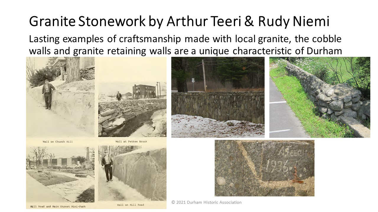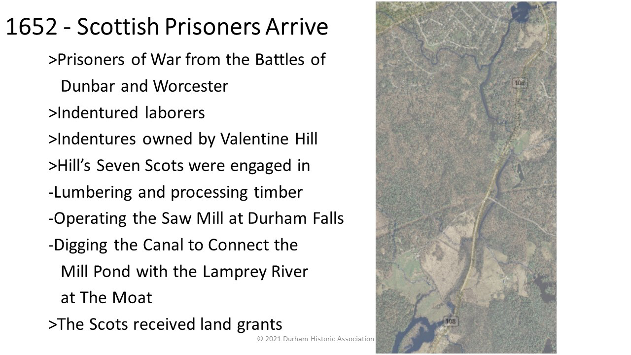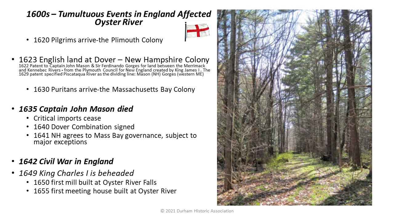 - 1649: Valentine Hill and Thomas Beard are granted the first falls of the Oyster River and construct a dam and saw mill