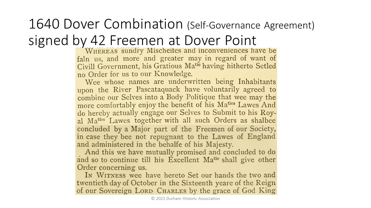 - 1640: The Dover Combination is signed by the freemen of the Dover, including Oyster River