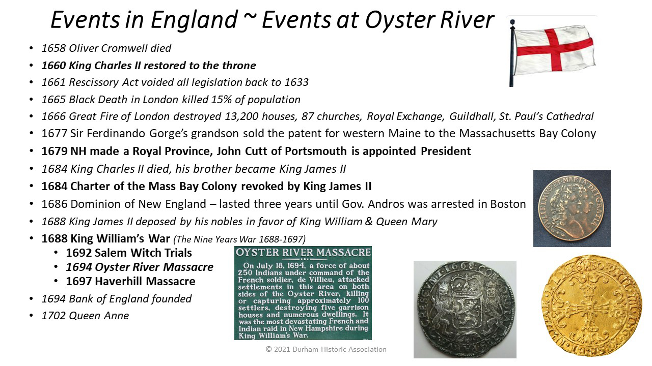 - 1694: Indians from northern Maine, controlled by the French, attack Oyster River to break the Peace Treaty signed in 1693. Crops are destroyed, cattle killed, garrisons and houses plundered and burned, many residents are killed or taken away to be used as slaves or sold to the French