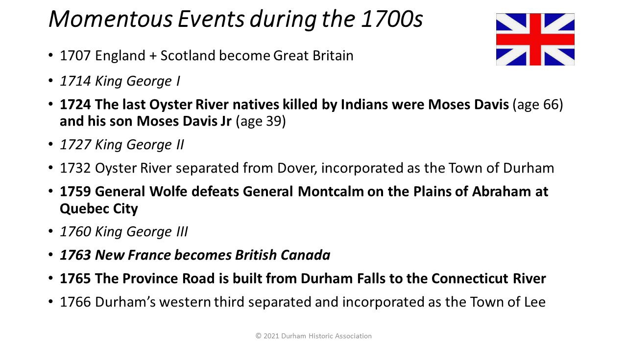 - 1732: Oyster River is incorporated as the Town of Durham