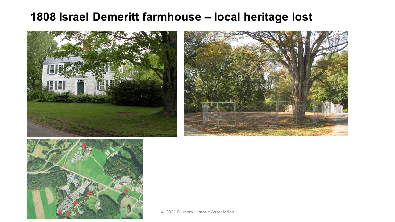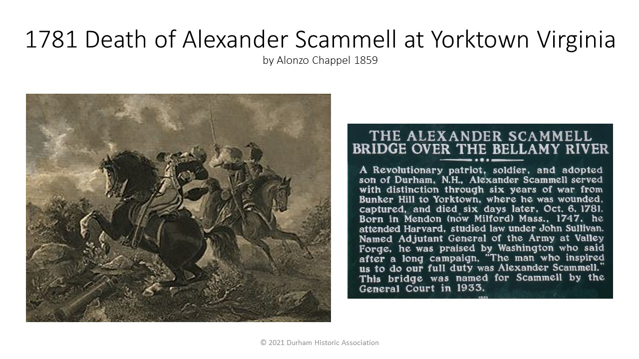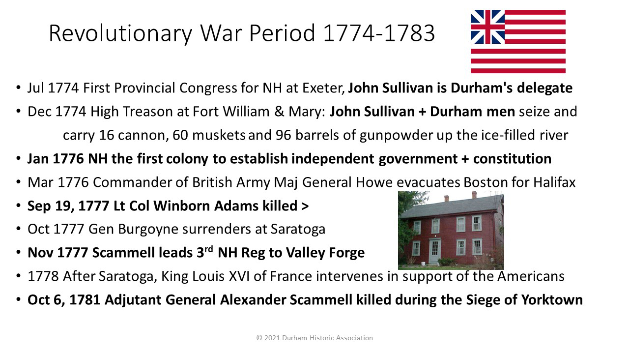 - 1774: In the first acts of treason, Durham men take weapons and gunpowder from Fort William and Mary at Portsmouth harbor by gundalow to the Meeting House at Durham Falls; some of the powder is later used at the Battle of Bunker Hill
