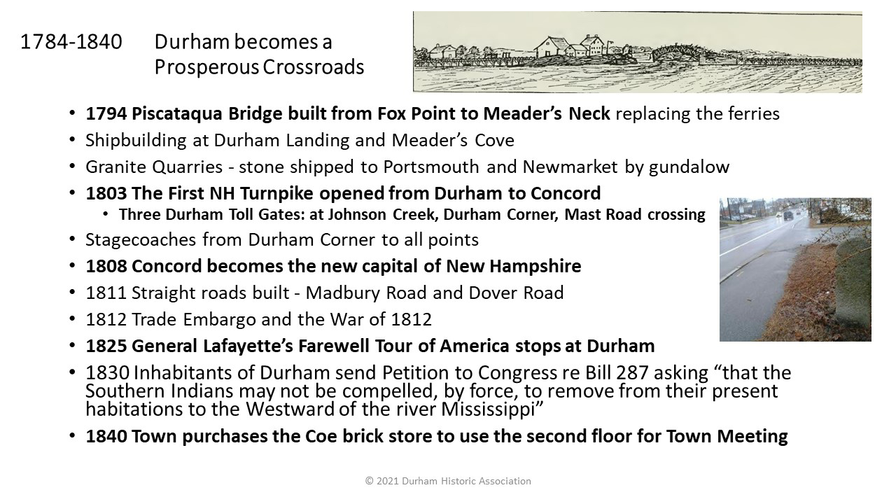 - 1794-1855: Piscataqua Bridge, a 2,363 foot oak wonder, crosses the river to connect Newington with Durham, where the First New Hampshire begins, linking Durham to Concord