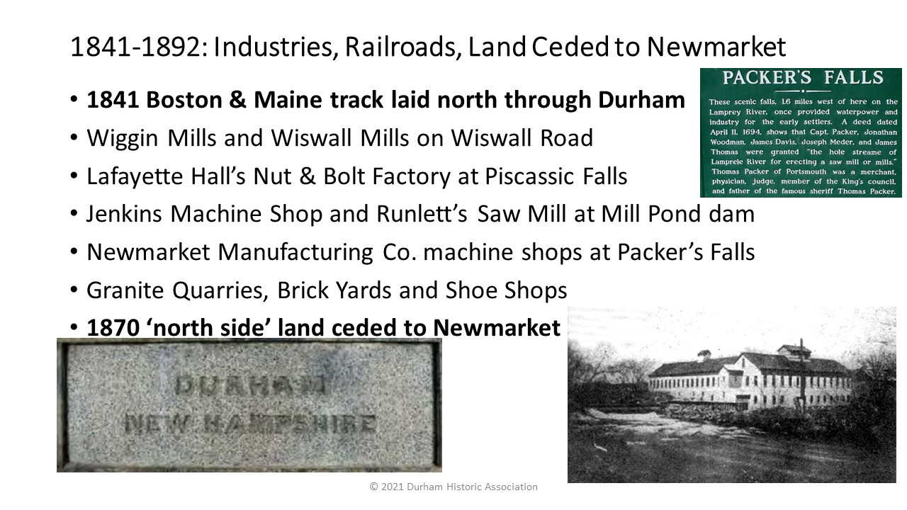 - 1841: The Boston & Maine Railroad is built through Durham, north to Dover