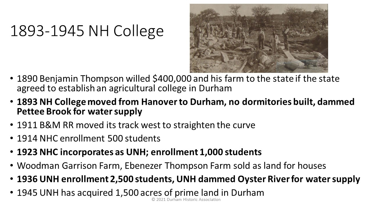 - 1893: New Hampshire College of Agriculture and Mechanic Arts moves from Hanover to Durham on land willed by Durham resident Benjamin Thompson