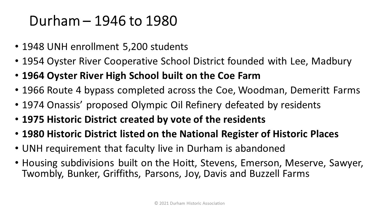 - 1946: An influx of World War II veterans with GI Bill benefits sparks continuing growth of UNH and Durham.