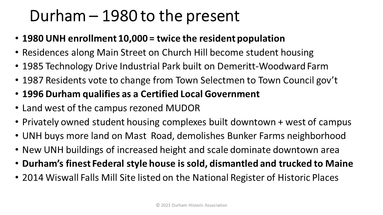 - 1987: After 255 years of Durham Town Meetings and Selectmen, Durham votes YES to change its Town Charter to a Town Council and Administrator form of government